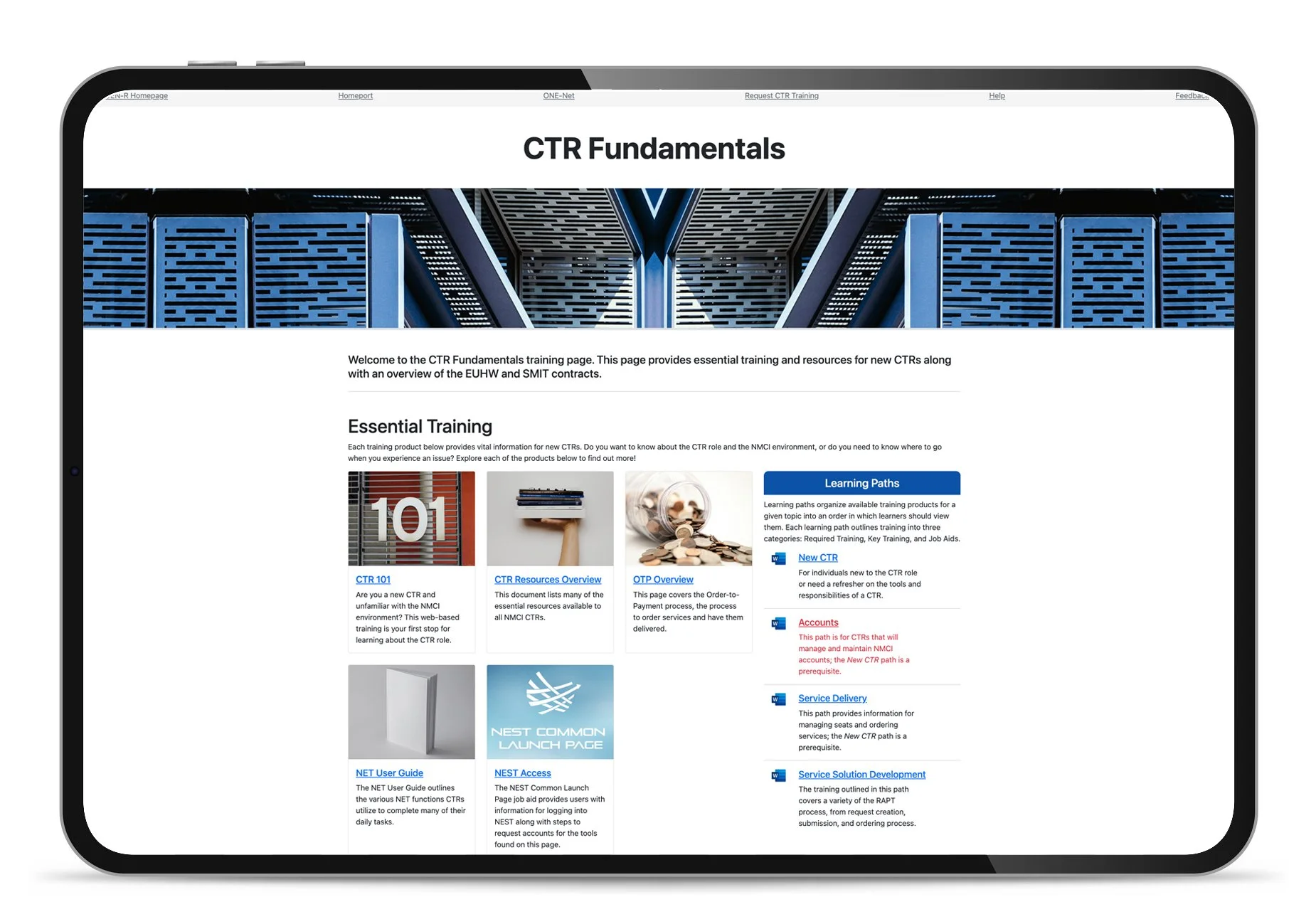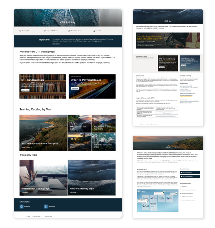 Two of my major efforts involved independently designing and building training websites that served as centralized hubs for all training and task-support resources. These sites organized materials into a single, well-organized location, making it easier for learners to find what they needed while giving the team better control over maintaining and updating training content.